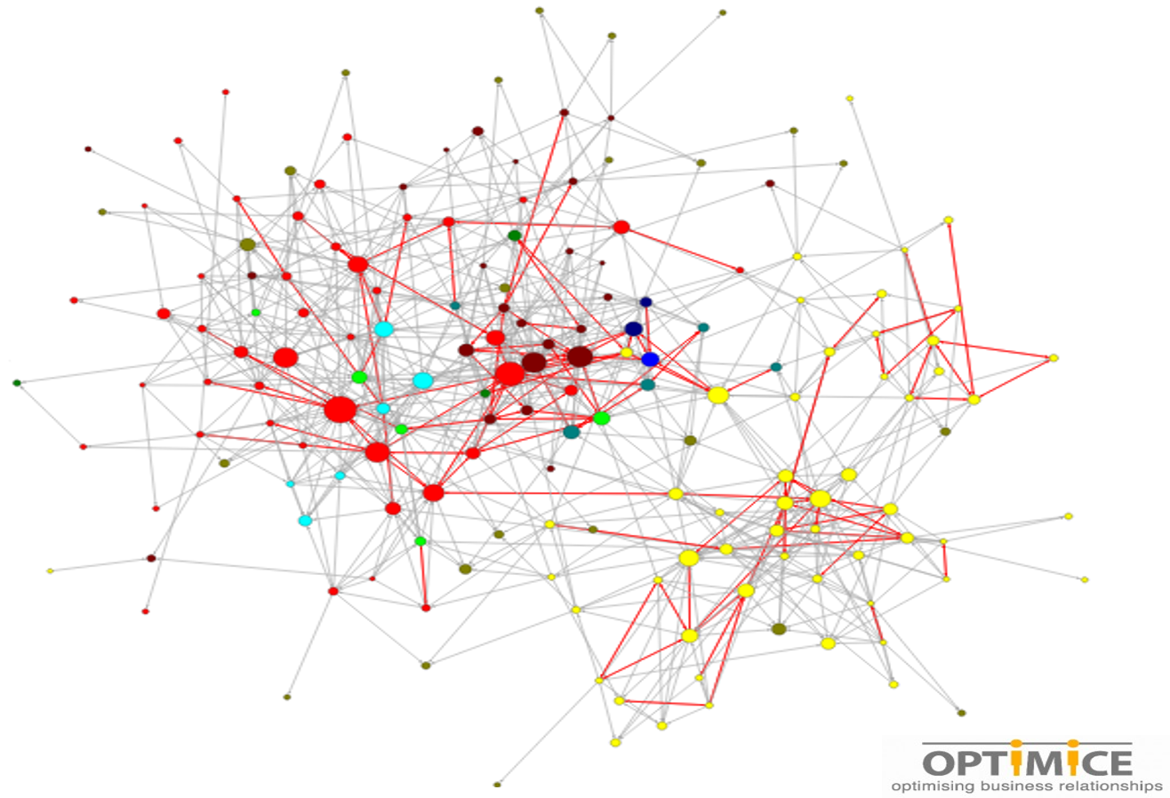 Below is an example of an SNA map to show collaboration patterns across different business units (different coloured nodes) in a part of a well known organisation. The live map is dynamic and can be filtered many ways including to show intact team connections and for the idea and energy networks in organisations, fascinating stuff! In this example, after Optimice mapped the data the IECL worked closely with the network through insight and action workshops and collaboration forums to find motivators to create membership and mobilise the network during a period of transformation. The results have been highly impressive including a 15% increase in employee engagement this year.